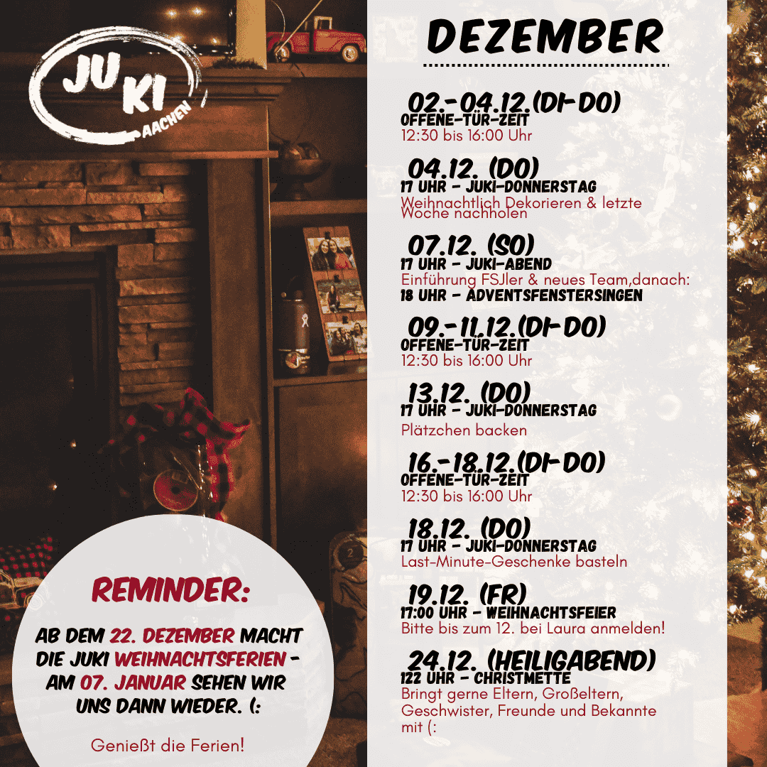 Danke für die Zusammenarbeit, die Einblicke in euer Leben, geteilte Gefühle und Gedanken. Danke für die vertrauensvollen Gespräche und die witzigen Alltags-Momente. Ich find es toll, dass die JuKi ein Ort ist, an dem Leben so sehr geteilt wird! Ich wünsche euch, dass ihr auch in Zukunft gute Gemeinschaft erlebt, weiterhin coole und kreative Ideen habt, Glauben und Leben teilt und immer mehr Jugendliche dazukommen. Ganz viel Segen für euren Weg!